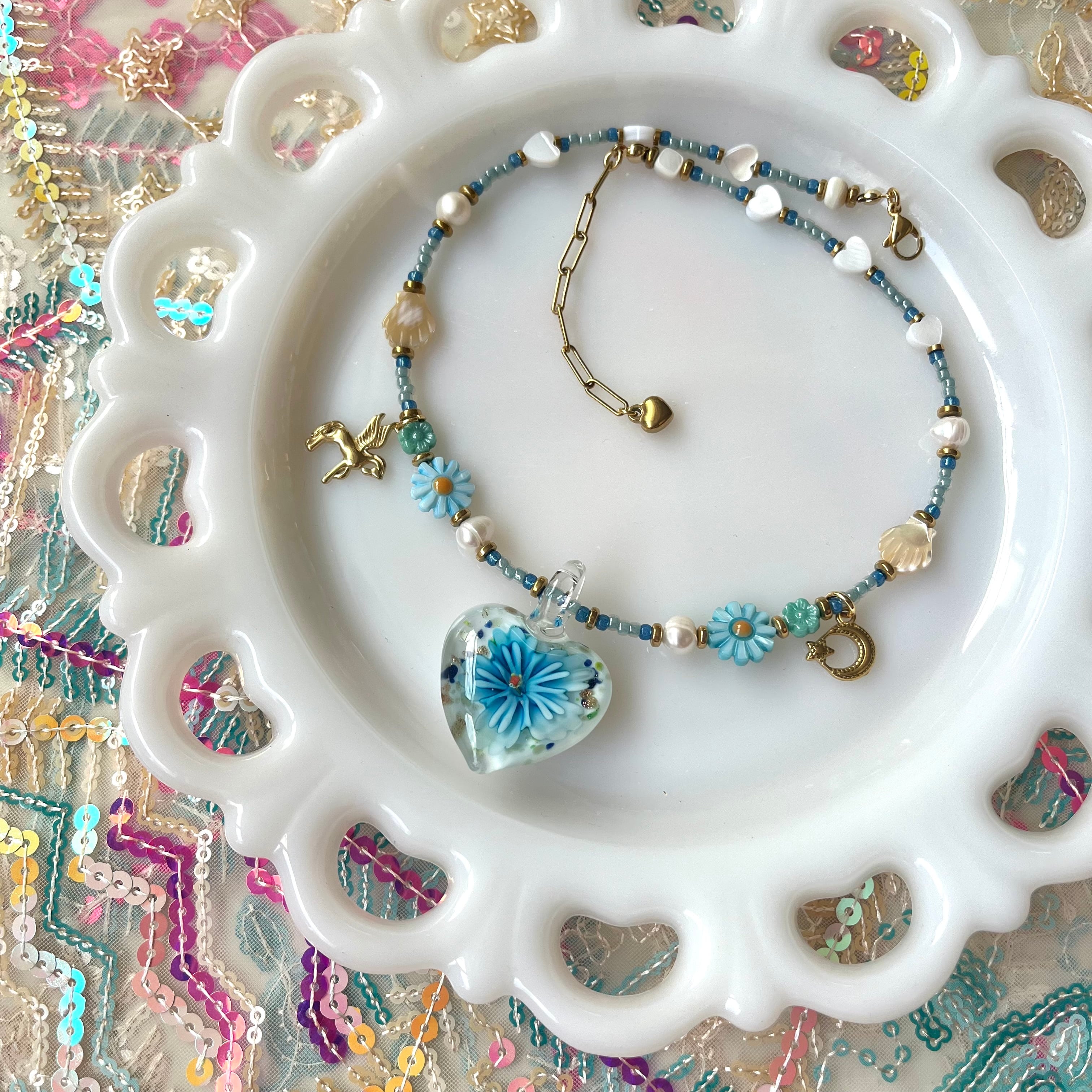 立体的に広がるフラワーモチーフを閉じ込めた、ハート型のペンダント。