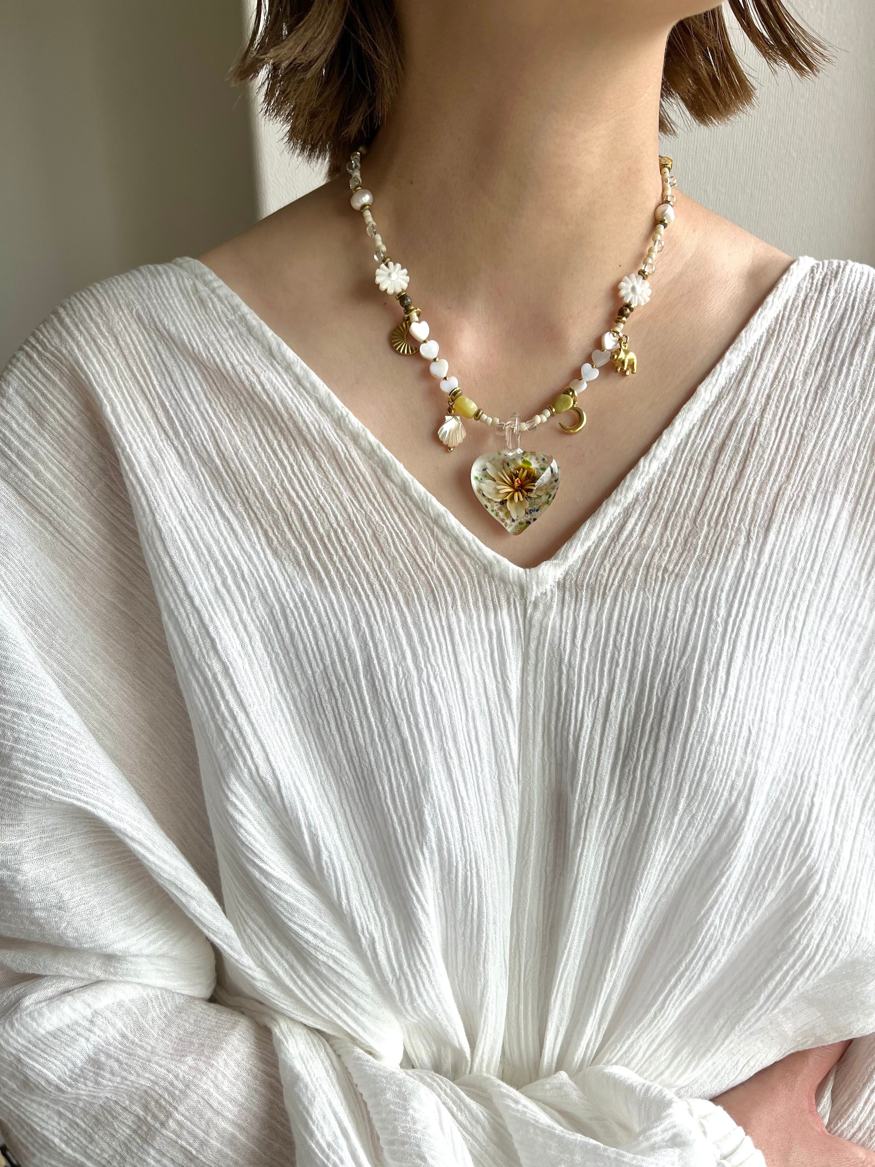 シェルや天然石、ガラスビーズなど、異なる質感の素材を組み合わせることで