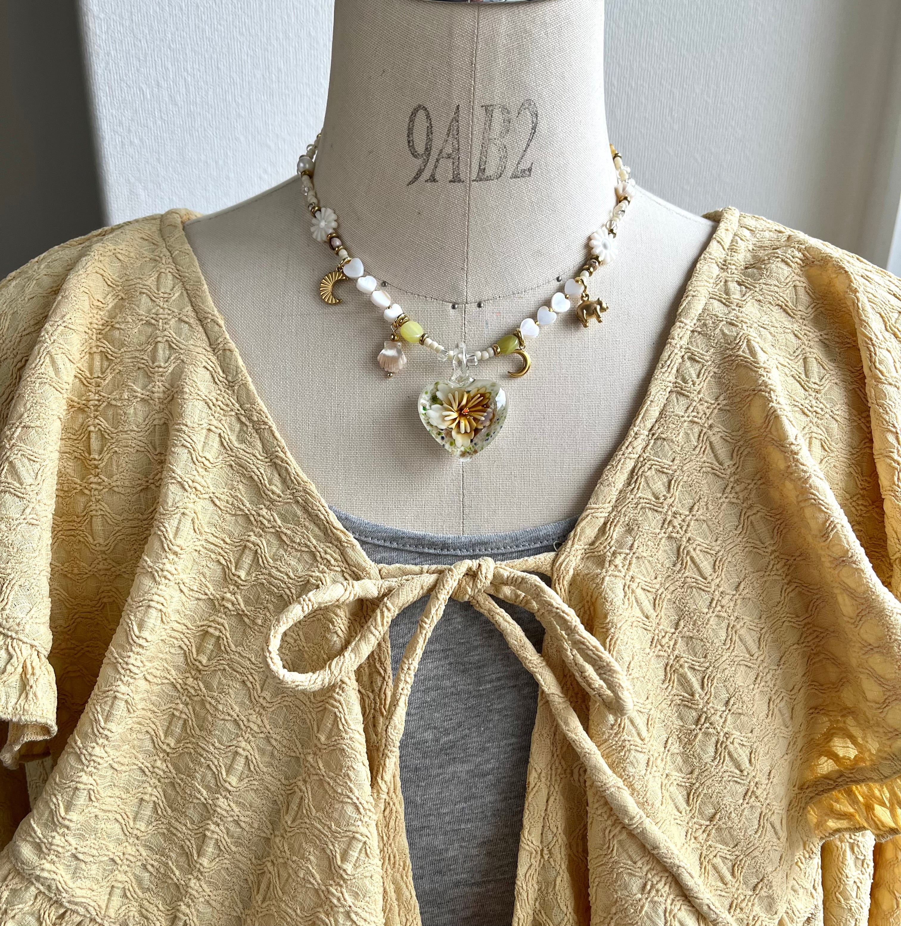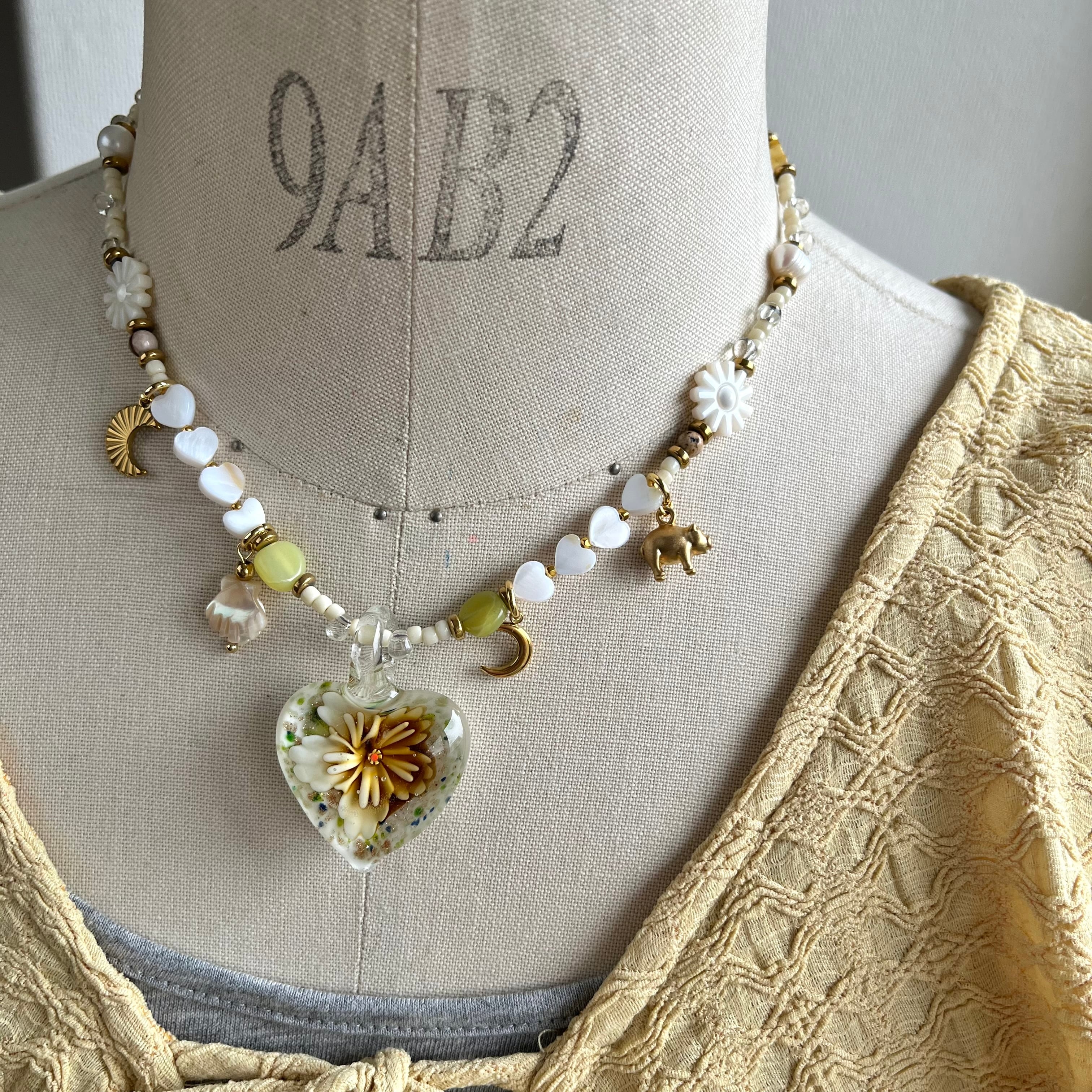 立体的に広がるフラワーモチーフを閉じ込めた、ハート型のペンダント。