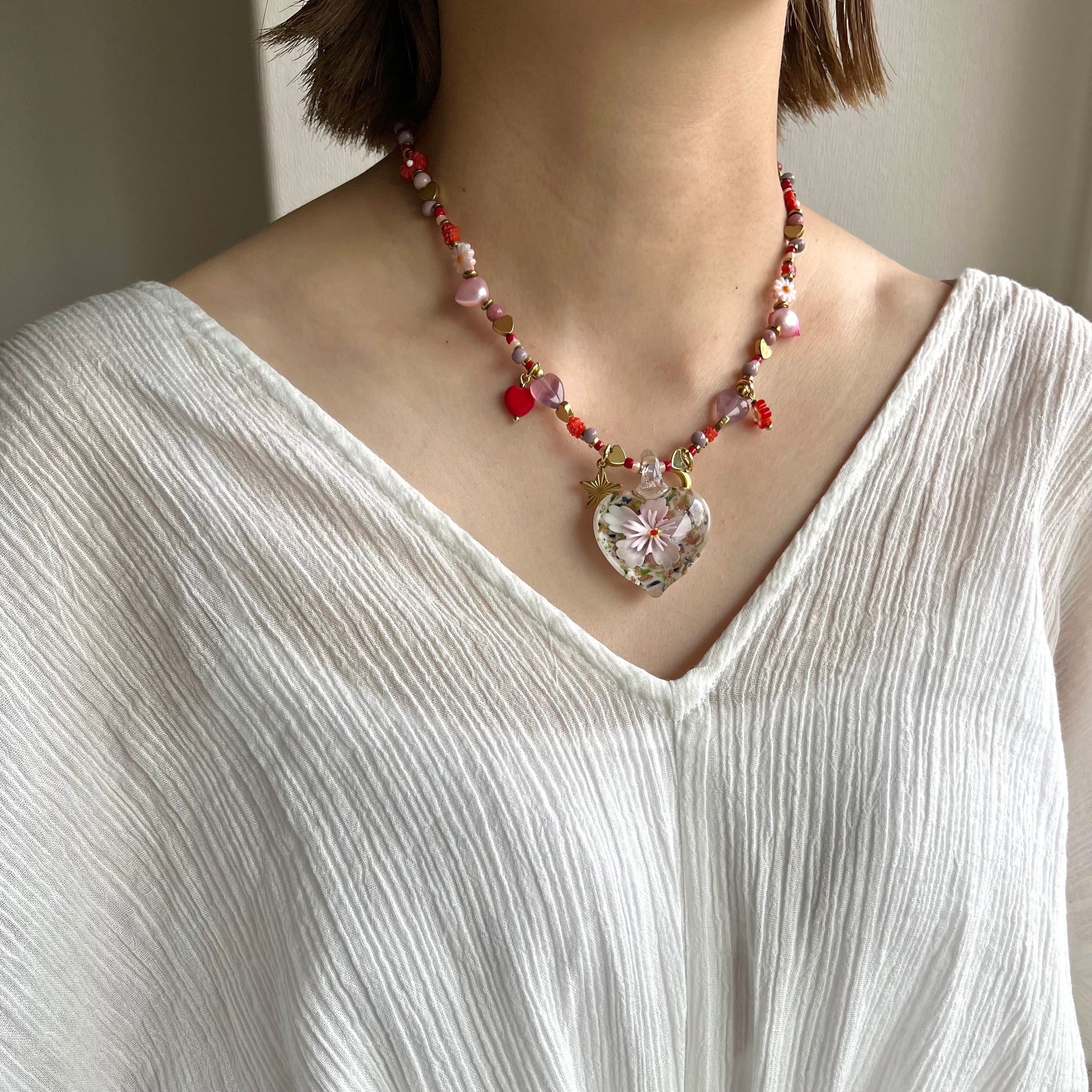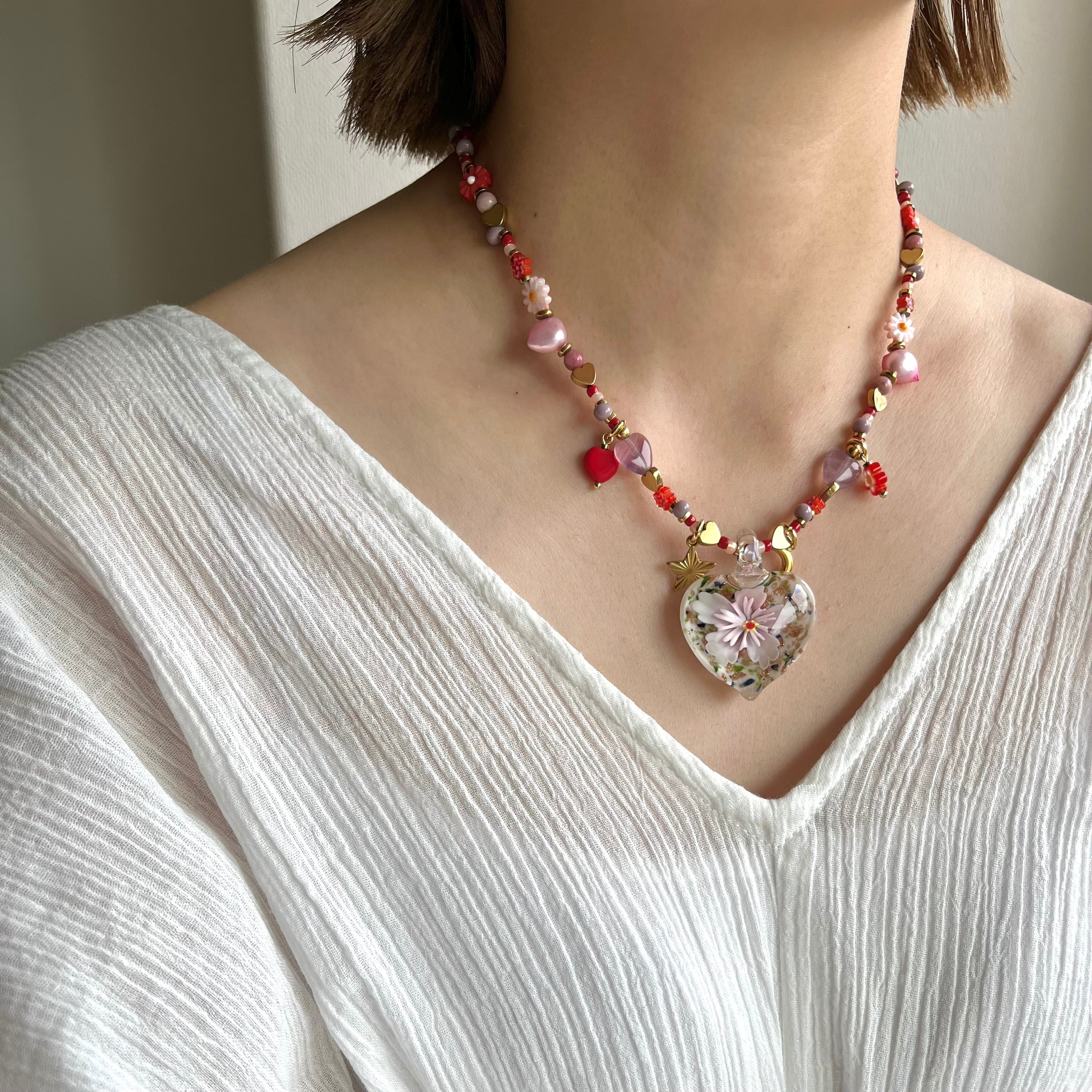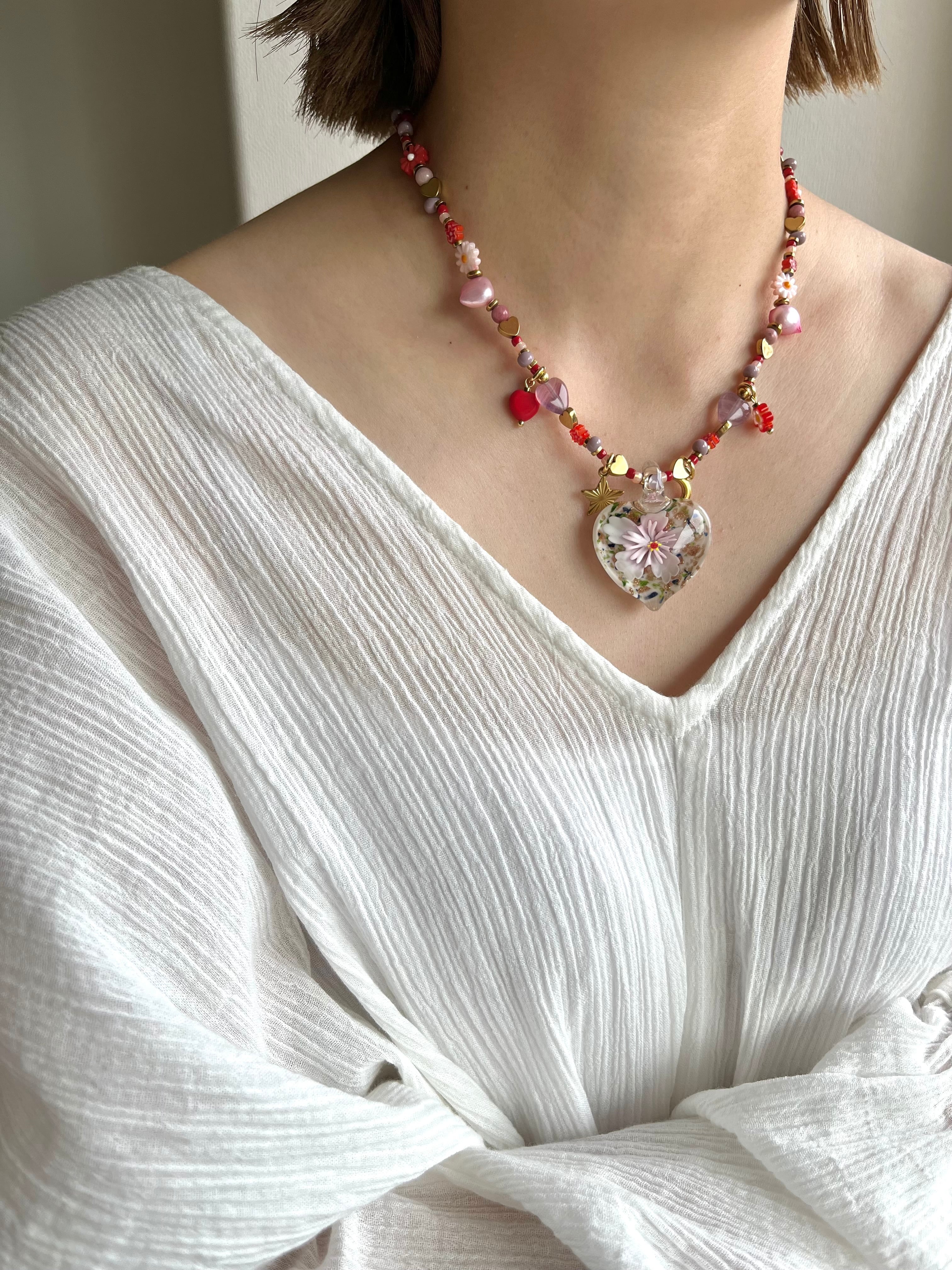 Glass Heart Floral Necklace pk